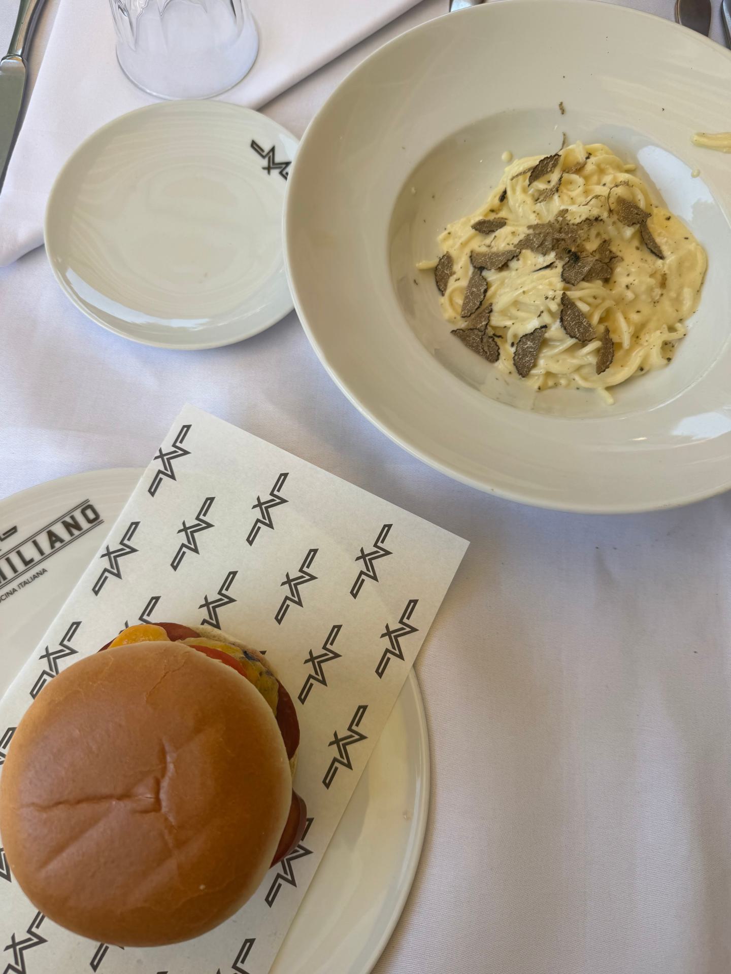De absolute showstopper is de beroemde Pasta Flambé — aan tafel bereid, met een spectaculaire vlam in een uitgeholde Parmezaanse kaas. Romig, intens en onvergetelijk.